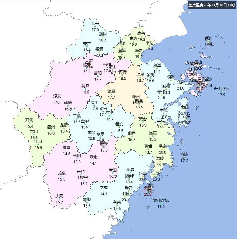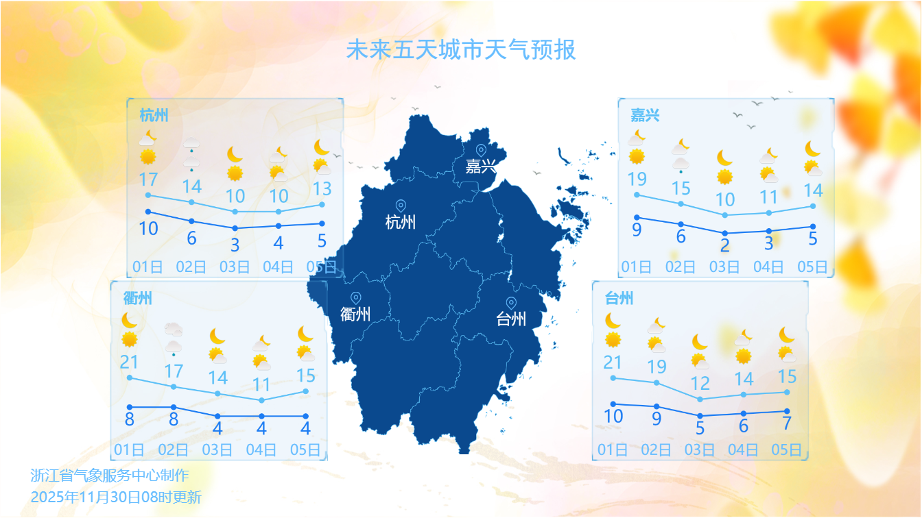 今天(11月30日)是本轮回温的顶点!明天,随着一股弱冷空气影响,浙江上空的云会有所增多,最高气温也会随之下降不少。